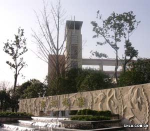 這是浙江某住宅小區的大門主景,一道很有氣勢的長條雕塑墻下,流水潺潺;雕塑墻后,是個樹壇:中間主景樹是銀杏,兩邊兩棵香樟,背景有四五棵桂花。