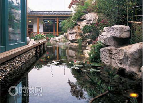"通",是由于設計師王凱豐用前后兩條回廊貫通了園內書房、茶室、餐廳三個主體建筑,廊下有潺潺的流水,彼此間相連而又自成一體。中國式的小庭院,木質結構的裝飾品,賦予了花園以素雅、空靈的性格,將江南古典園林的獨特韻味點化在淡泊寧靜的自然美學之中。