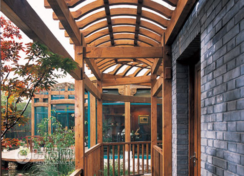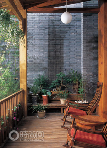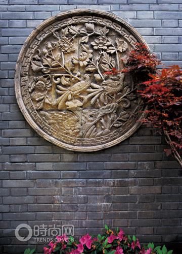 青石墻上的古典磚雕紋樣寓意吉祥,紅楓和杜鵑的點綴為古典的空間氛圍增添了活潑元素.