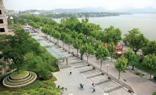 威廉·卡拉威:曾經(jīng)有一位杭州的房地產(chǎn)發(fā)展商告訴我,許多中國人對自己的設(shè)計品位并不自信。他認(rèn)為其部分原因是:盡管在歷史上中國曾經(jīng)在藝術(shù)和設(shè)計方面是佼佼者(甚至中國書法也是一門獨特的藝術(shù)),但是由于長達近50年的集中控制,藝術(shù)和設(shè)計一直不在優(yōu)先考慮之列。在我們展開中國項目的最初幾年里,客戶常常在回應(yīng)我們所提出的設(shè)計構(gòu)想時表現(xiàn)得比較遲疑。相形于視覺設(shè)計方面,他們關(guān)注的重點更多地集中在設(shè)計的功能性以及工程造價。許多客戶也傾向于非常保守的風(fēng)格。但是最近幾年這樣的狀況正在逐漸改變。我們的客戶在親眼目睹許多遍及全中國的優(yōu)秀設(shè)計項目之后,他們不僅非常自信于他們所想達到的目標(biāo),而且更加積極地把他們的意愿體現(xiàn)到設(shè)計之中。 ![]() 杭州湖濱(SWA供圖) USD:中西方的景觀設(shè)計項目的設(shè)計周期有什么不同?程序上又有哪些變化? 威廉·卡拉威:中國是一個快節(jié)奏的國家。許多客戶急于把事情立即完成。我認(rèn)為在這種情況下,相對景觀設(shè)計師而言建筑師面臨更大的挑戰(zhàn),因為建筑設(shè)計需要更多的時間來完成從設(shè)計、成圖到建造等一系列工作。對個人而言,我很喜歡這種在中國辦事風(fēng)風(fēng)火火的風(fēng)格,因為在美國一個工程從批準(zhǔn)到設(shè)計完成往往要耗費數(shù)年。
