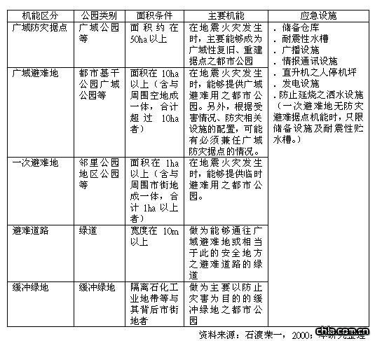 (三)防災(zāi)公園的種類和選定條件 1.公園種類 防災(zāi)公園并非只有在災(zāi)變時才能被利用,而是依據(jù)都市公園配置計劃所建設(shè)出來的一般都市公園,平時作為一般公園而在災(zāi)害發(fā)生時具有前述般明確的機能,且能因應(yīng)災(zāi)變的公園。對應(yīng)于防災(zāi)機能,公園綠地種類及其相關(guān)要項如表7。 表7 防災(zāi)公園之種類(點擊查看大圖) ![]() 2.選定條件 依對象都市地區(qū)專業(yè)地點等條件說明如下: (1)對象都市 只限具廣域避難地機能之都市公園。 (2)危險區(qū)域 都市中大規(guī)模地震發(fā)生時具危險性之區(qū)域。 (3)規(guī)模 A.具廣域防災(zāi)據(jù)點機能之都市公園 面積約為50ha以上之都市公園。 B.具廣域避難地機能之都市公園 面積約為10ha以上之都市公園;但都市公園面積在10ha以下者,只要其與周圍空地合為一體,面積達10ha之都市公園亦包含在內(nèi)。 C.具一次避難地機能之都市公園 面積約為1ha以上之都市公園;但都市公園面積在1ha以下者,只要與其周圍市街地合為一體,面積達1ha之都市公園亦包含在內(nèi)。 D.具廣域避難地機能之都市公園 寬度在10m以上者。 (4)其它 有助于該都市公園之防災(zāi)機能,被定位于依據(jù)災(zāi)害對策基本法之區(qū)域防災(zāi)計劃等中者。 (四)防災(zāi)公園綠地設(shè)計四化原則:(王小璘,2008) 1.功能化: (1)舉凡公園廣場出入口、園道、外圍道路、開放空間或地下避難空間,均須能因應(yīng)緊急狀況發(fā)生時的人潮、車輛等交通動線的暢通、安全和連續(xù)性。故其寬度、形狀、高差、障礙物及鋪面結(jié)構(gòu)等均應(yīng)足以配合。 (2)各種水體相關(guān)設(shè)施如貯水槽、緊急用水井、灑水設(shè)備和水池等,除應(yīng)具有耐震性,確保水質(zhì)的適宜性和水量的充足性外,更應(yīng)儲存足夠的水源以供各種用水之需; (3)其它包括信息、能源、照明等相關(guān)設(shè)施以及儲備倉庫或指揮中心等相關(guān)設(shè)施,亦應(yīng)視質(zhì)量的需求而設(shè)置。 2.生態(tài)化: (1)以景觀生態(tài)網(wǎng)絡(luò)的建構(gòu)提升其環(huán)境生態(tài)效益。 (2)選用生性強健及耐火性高的地方樹種,以植栽設(shè)計達成凈化環(huán)境,節(jié)能減碳和防災(zāi)避難的功能。 (3)防火樹林帶須選種植葉肉厚、油脂少、水份多的常綠喬木,采交錯無間隔多層次配置提高防火效果。 (4)建物及硬質(zhì)鋪面應(yīng)盡量以平面或垂直綠化,增加綠化面積。 (5)配合區(qū)域性生態(tài)資源調(diào)查,建立完整的區(qū)域性生態(tài)數(shù)據(jù)庫,作為規(guī)劃設(shè)計時的參考依據(jù)。 3.人性化:公園綠地不僅提供休閑、游憩、集會、活動之用,更可作為紀念、心靈療傷、環(huán)境教育和科學研究的最佳場所,因此除 (1)必需符合使用者的需求。 (2)以抽象或具象的景觀設(shè)計手法,營造一個足以令人緬懷,充實知識的氛圍和場所。 (3)以動態(tài)景觀的生態(tài)思維,藉由生長中的樹木展現(xiàn)強烈的生命感,藉以鼓舞受難的災(zāi)民和親人。 (4)透過小區(qū)總體營造,將綠地重建納入小區(qū)環(huán)境改造的一部分,經(jīng)由民眾參與的方式,提升民眾對小區(qū)環(huán)境價值的認知及對小區(qū)的認同感和向心力,進而反饋至小區(qū)環(huán)境本身。 4.產(chǎn)業(yè)化: (1)在整體規(guī)劃的前提下,將部分公園劃為耕作區(qū)供災(zāi)民或民眾種植蔬果,既可疏緩災(zāi)民生計上的負擔和壓力,又可增加園區(qū)的產(chǎn)值。 (2)透過激發(fā)在地居民的文化意識認知和實質(zhì)技能的培訓,將潛藏的文化資產(chǎn),透過不同的方式具體呈現(xiàn)。 四、植物的防災(zāi)機能和應(yīng)用 樹木樹林在大震災(zāi)時具有多方面的防災(zāi)功能,如何發(fā)揮更大的效果,可由三方面著手: (一)植栽的配置 1.防火植栽 以保護內(nèi)部之避難廣場免于市街地為目的的植栽,故以圍住公園外圍方式予以配置;特別是對于木造密集地或工場等周圍,有必要采取重點式配置。另外,為了使植栽帶能充分發(fā)揮其機能,必須與市街地保持一定距離,以期樹冠不會受到火勢的包圍。 2.避難廣場植栽 以草坪等植栽為中心,樹木的配置以不影響其機能為原則。地標植栽或誘導植栽應(yīng)配置于入口周圍或園道旁,撫慰心靈的花卉等則配置在帳篷、臨時住宅等周圍。 (二)植栽的構(gòu)成 1.防火植栽 (1)樹冠等可做為盾牌,以遮斷輻射熱。 (2)盾牌效果,促使消防工作容易進行。 (3)減弱樹木周圍風的強度,防止火勢偏向一方,藉此使熱由上方逃逸。 (4)抑制風的流竄,減少火災(zāi)的變動,抑制因接觸而引起延燒的危險度。 (5)藉由抑制亂流的產(chǎn)生,可降低火灰掉落在避難廣場上之機會。 2.避難廣場植栽 應(yīng)盡可能避免樹木的種植,而以草坪等地被植物為主;但也需考慮樹木可做為標示避難廣場之地標或支柱之功能。 (三)植栽的規(guī)模 規(guī)模的設(shè)定需考慮與火災(zāi)之間的相對關(guān)系;一般認為加上空地約需50~100m之植栽帶。 五、防災(zāi)公園的管理和維護 公園綠地的震災(zāi)功能和效果,有賴平時及災(zāi)害發(fā)生后的基本營運和管理。 (一)民眾參與經(jīng)營和管理之實施 平時施行民眾參與型的管理或積極推動居民利用,可以形成居民之間的互動,藉此在災(zāi)害發(fā)生時有效推動救