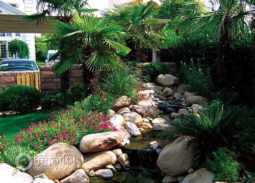 ◆ 200㎡以上大面積花園可造水景 擁有一個私人池塘夢想的第一步是擬定正確的規劃。花園池塘應該建造在靠近院子或者座椅旁,便于欣賞。如果花園池塘帶有噴泉的話,建造在花園的中央會看上去更好些。 第二步,要為池塘找一個合適的地址。最好每天陽光照射的時間在4~6小時以內,以便確保水池深水區的水溫不會過高。不要把池塘設計在落葉樹和針葉樹的附近,因為跌落的樹葉和松針會影響水質,樹根的生長也會影響水池的結構。 選好地點之后,按照規劃的方案,先挖好大小適度的坑,然后在上面鋪設10cm厚的黃砂,最后再鋪上專用的池塘襯墊,整理好以后,根據設計方案裝飾,接上專業的花園池子過濾系統就大功告成。一般而言,4㎡以內大小的池塘在平地鋪設時按照相應的專業意見,完全可以DIY完成,更大面積的則需要尋求專業團隊的幫助。