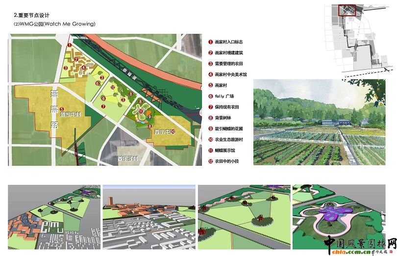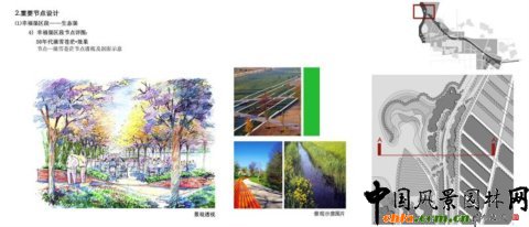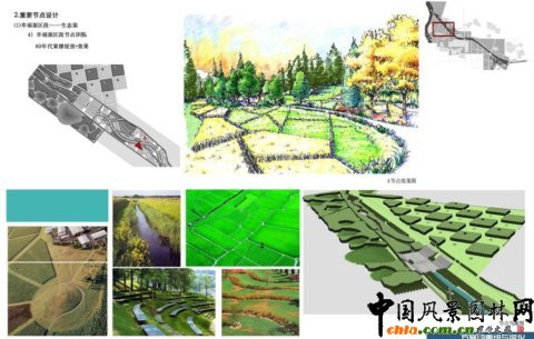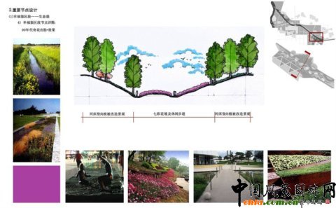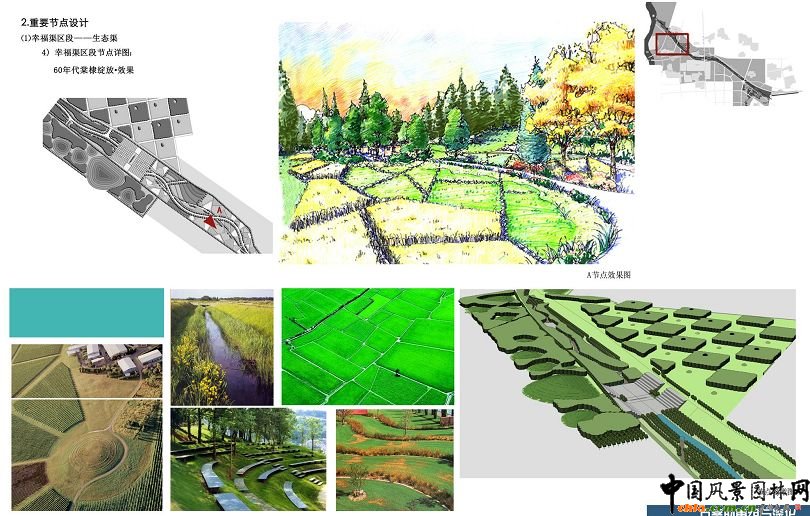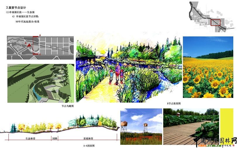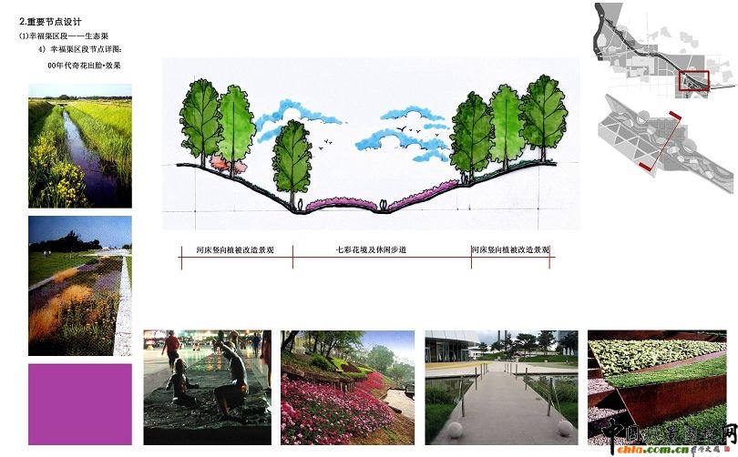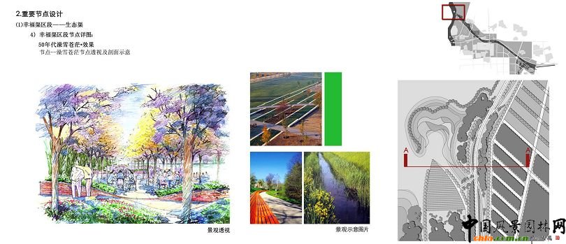二、燕郊開發(fā)區(qū)幸福渠綠化景觀帶和尹家溝治理改造工程規(guī)劃設(shè)計方案。 1、隨著大北京策略的規(guī)劃建設(shè),三河市的農(nóng)業(yè)、工業(yè)迅猛發(fā)展:現(xiàn)代高效農(nóng)業(yè)、蓬勃興起的現(xiàn)代制造業(yè),隨之而帶來的是環(huán)境的污染與破壞,如何在保持經(jīng)濟的穩(wěn)步發(fā)展中建設(shè)生態(tài)綠色的三河市已經(jīng)成為重要的課題。兼顧第一二產(chǎn)業(yè)的同時,著重發(fā)展第三產(chǎn)業(yè)。在建設(shè)環(huán)京津休閑旅游產(chǎn)業(yè)帶的要求下,挖掘具有特色的旅游生態(tài)產(chǎn)業(yè),帶動周邊產(chǎn)業(yè)的發(fā)展建設(shè),同時也促進周邊環(huán)境健康可持續(xù)的發(fā)展。 我們力爭充分發(fā)揮區(qū)位和資源優(yōu)勢,提出大力發(fā)展以休閑旅游為龍頭的現(xiàn)代服務(wù)業(yè),滿足北京規(guī)劃中東部以休閑游憩為主的旅游休閑公園的定位。以建設(shè)體現(xiàn)燕郊農(nóng)耕文化、田園風(fēng)光為特色的家庭旅游、會議旅游地為設(shè)計目標(biāo),景觀延續(xù)方案的場地肌理,整治水系,增加樹林草地與活動空間,再利用周邊的用地建設(shè)度假村、酒吧、會議中心及休閑俱樂部,添補北京東部休閑旅游的空白。 2、設(shè)計的主題:幸福的彩虹。 ![]() 1958年三河縣委決定開挖引潮灌渠,從此潮白河水開始為本縣農(nóng)業(yè)生產(chǎn)服務(wù),灌渠被人們譽為"幸福渠"。目前幸福渠隨著現(xiàn)代化的建設(shè)面臨著河渠廢棄、兩岸荒蕪,污染嚴(yán)重。如何對幸福渠進行重新利用為居民造福?本方案再塑幸福、綠色生態(tài)的景觀渠,形成一道幸福的彩虹,貫穿在燕郊,再次造福于民。這條幸福的彩虹是人對幸福的體驗,其中幸福渠主要是從縱向上來講,對人生不同階段的幸福的體驗,尹家溝也同時成為幸福彩虹的一部分,是從橫向上來說,不同的人對幸福的詮釋。 3、設(shè)計特色:一條幸福的彩虹:二個長廊一個面,十六個節(jié)點 兩個長廊――――生態(tài)景觀長廊(幸福渠): 幸福渠根據(jù)其地理位置以生態(tài)改造現(xiàn)有環(huán)境條件為主配合郊野旅游的設(shè)計方向,結(jié)合幸福的彩虹的主題,將彩虹的7種色彩融入進每一個時代和景點。 文化景觀長廊(尹家溝)―――尹家溝位于燕郊內(nèi)部東側(cè),與居民生活有密切關(guān)聯(lián),成為體現(xiàn)當(dāng)?shù)匚幕瘹v史的城市濱水公園。 一個面―――Wmg公園:建立幸福渠和尹家溝的生態(tài)廊道,同時鏈接兩條不同幸福的脈絡(luò),以一個小孩追逐著蝴蝶的蛻變過程的設(shè)計形態(tài),詮釋著幸福的不同角度。 十六個節(jié)點:―――幸福渠階段:運用不同年代人對幸福的體驗塑造八景:50年以前豳風(fēng)奉觴;50年代澡雪蒼茫;60年代棠棣綻放;70年代清秀英華;80年代櫛風(fēng)浴露;90年代旭起晨光;00年代奇花出胎;01年代啟滯無疆。 尹家溝階段:運用不同的設(shè)計手法,塑造多重體驗空間,包括:傳統(tǒng)的設(shè)計手法畫家村共生,現(xiàn)代的設(shè)計手法彩虹公園,以及未來的shopping mall。凸顯八個景觀節(jié)點:河蒲灣、陶陶廣場、拂草園、生生園、九九廣場、桃花渡、未來shopping mall。 (1)幸福渠節(jié)點設(shè)計―――生態(tài)渠。 豳風(fēng)奉觴:執(zhí)手在記憶之舟--共賞余陽偕老的幸福。 ![]() 澡雪蒼茫:暢想的流金歲月--七色嶺"抒寫絢爛與輝煌"的幸福。 ![]() 棠棣綻放:老電影放映場--"棠棣融融載其華"的幸福。 ![]() 清秀英華:交錯的道路--三十而立的沉穩(wěn)與幸福