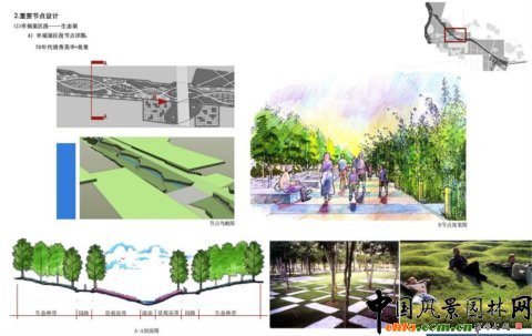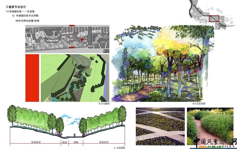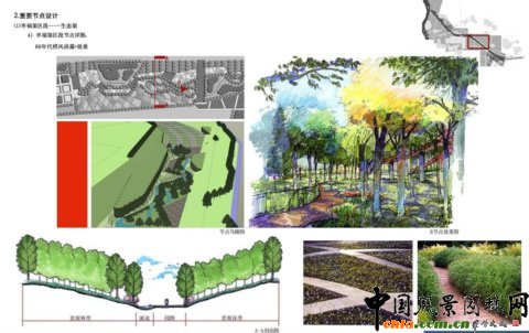 櫛風(fēng)浴露:豐富材質(zhì)的道路與休憩節(jié)點--二八年華溫馨熾熱的幸福。 ![]() 旭起晨光:觀鳥亭、極限運動廣場--90后年輕無極限的幸福。 ![]() 奇花出胎:繽紛的花帶與潺潺的溪水--新一代懷抱希望蓬勃朝氣的幸福。 ![]() 把中國歷史幾個總要階段進行梳理,經(jīng)過漫長的歲月和艱苦的奮斗,老一輩午餐階級革命者。豳風(fēng)奉觴--此節(jié)點主要為老年活動區(qū),觀景平臺、為老年提高休閑鍛煉的場所,時代廣場也為老一輩新中國的建設(shè)者們提高了尋找時代記憶的精神場所。體現(xiàn)出對老一輩為新中國崛起做出自己貢獻的尊敬。50年代:新中國百廢待興,50年代人們從新中國的花朵到社會主義事業(yè)的骨干棟梁之材,像澡雪青松一樣長青挺拔.。澡雪蒼茫--此節(jié)點主要體現(xiàn)50年代的時代特征,曾經(jīng)50年代的人經(jīng)歷了歷史的洗禮已經(jīng)步入中老年階段,他們這一輩為祖國的強盛奉獻了自己的青春年華。極富觀賞的七色嶺為他們抒寫絢爛的輝煌,流金廣場提供了非常好的休閑放松場所。60年代:芬芳錦繡花盛過, 鬢角新增花白發(fā)。 芝草蒲陶還相繼, 棠棣融融載其華。 發(fā)揮余熱留香溢, 一米陽光溫似夏。 攜手家人享清福, 微笑神怡待新芽。以生態(tài)的景觀手法展現(xiàn)60年代人們的幸福,營造"棠棣融融載其華"的意境。豐富的大地景觀仿照當(dāng)時農(nóng)莊的景象;老電影放映場勾起當(dāng)年的回憶;大線條的草階景觀表現(xiàn)60年代團結(jié)大氣的時代特點。青色的麥田景觀色塊,拼接出簡單質(zhì)樸的性格,最實在的幸福。70年代: 他們?nèi)ⅲ?開始撐起一個家庭的未來希望; 他們跨越時代, 開始豎立一支堅固的中流砥柱; 他們經(jīng)歷變遷, 他們積累閱歷, 他們求新創(chuàng)變; 他們敢于拋棄傳統(tǒng)束縛, 他們勇于前進敢于拼搏, 他們是這個時代的清秀英華…… 以豐富的景觀形態(tài)營現(xiàn)70年代的幸福,展現(xiàn)那個時代的清秀英華。70年代改革開放,時代變遷,我們以交錯的道路展現(xiàn)新舊交接的碰撞與融合。中間潺潺的流水,洗潤出新的景象。藍色的薰衣草花帶,色彩變幻的草階,體現(xiàn)了70年代生人的沉穩(wěn)與責(zé)任感,三十而立的幸福。80年代:這是一個過度的時代, 比70后更勇于冒險, 卻沒有90后那般叛逆; 這是一個年輕的時代, 擁有著無限的朝氣, 卻又略帶一絲沉穩(wěn); 這是一個奔波的時代, 沐浴朝陽與露水, 身披星月與天灰; 這是一個淡定的時代, 追求浪漫與情調(diào), 享受青澀與微笑…… 以富于變化的景觀形態(tài),表現(xiàn)80年代的幸福,這是一個沉穩(wěn)與激情的過度時代。曲折的道路架于水系之上,隨著水往低處流走,人往高處前行。沿路設(shè)置多個休憩節(jié)點,木質(zhì)平臺,石材鋪裝各不相同,展現(xiàn)90后的不同個性。規(guī)整的草階景觀和紅色的玫瑰色塊,營造一種溫馨熾熱的氛圍,這是二八年華后心動的幸福。90年代:這是一個最新的群體, 更年輕、 更活力; 這是一個張揚的群體, 更自我、 更自信; 這是一個叛逆的群體, 更個性、 更獨立。 他們彰顯個性,他們桀驁不馴, 他們青春張揚,他們年輕無極限。 他們擁有強烈青春的味道…… 將豐富的生態(tài)景觀與現(xiàn)代的氣息結(jié)合,營造出90年代的幸福,這里擁有強烈青春的味道。木質(zhì)棧道將休息節(jié)點相連,休息平臺兩側(cè)設(shè)置觀鳥亭,親近自然同時探索自然。極限運動廣場為游客提供釋放自己的空間,穿越稻田的玻璃長廊體現(xiàn)傳統(tǒng)與新時代的融合。金黃的向日葵展現(xiàn)了90后的張揚與朝氣,這是年輕無極限的幸福。00年代后:這里是幸福渠的末端,而以我們的年代主線也走到了00年后,這里也是三色堇的世界,繽紛的三色堇,和穿行在里面的林蔭小道,身邊的色彩在陽光的斑點中雀躍。 橢圓形的花帶和波浪形的小徑構(gòu)圖,交叉的形狀勾勒出一塊塊開敞的休憩空間,在渠道河床原有的楊樹林下鋪滿彩色的地被形成豎向上的視覺享受。美麗的色彩給人身心上的愉悅,讓人在這片空間中充滿活力,充滿希望,充滿朝氣,好像回到了小時候,就像是00后的孩子們,無所顧忌,天真爛漫。