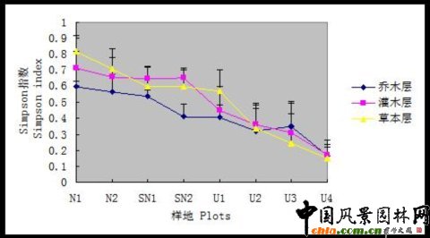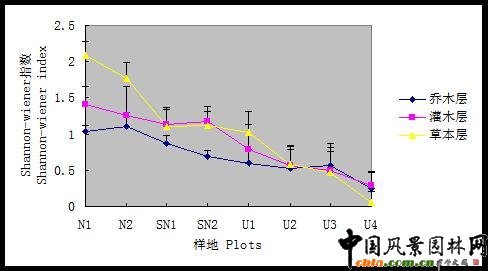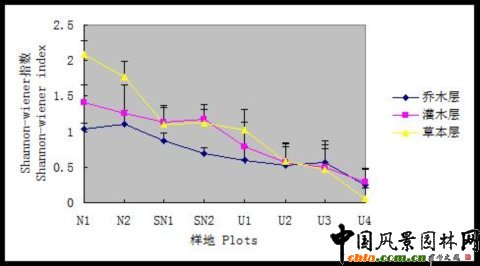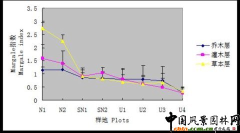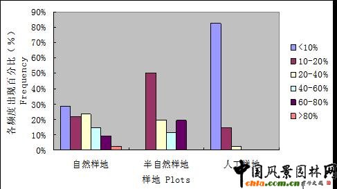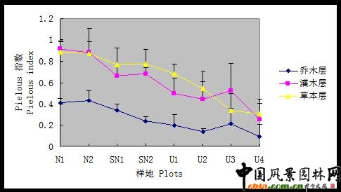 2.2 北京地區三類自然度生境植物頻度比較 圖3-1 北京地區三類自然度生境樣地的樹種頻度比較 ![]() 三類樣地樹種頻度分布差異性明顯。頻度覆蓋范圍表現為自然生境樣地>半自然生境樣地>人工生境樣地。而各頻度出現百分比關系則正相反。 2. 自然樣地各頻度級別內包含的植物數量相差不大,樹種分布相對平衡。 3. 人工樣地樹種頻度相對集中,頻度在<10%范圍內的樹種占83%,明顯高于其他級別的樹種數量,體現出樹種分布的嚴重不平衡特征。 2.3 北京地區三類自然度生境物種多樣性與生長型關系 2.3.1 物種豐富度指數與植物生長型關系 圖3-2 北京地區三類自然度生境樣地植物群落不同生長型中Margale指數比較 ![]() 群落各生長型的物種豐富度指數基本反映出隨自然度降低呈逐漸下降的趨勢,即自然生境〉半自然生境〉人工生境。其中草本層物種豐富度的變化趨勢最為明顯。 自然樣地群落各層次之間物種豐富度指數表現出草本層〉灌木層〉喬木層規律,且草本層豐富度指數明顯高于灌木層和喬木層,與已有相關研究結果一致。 2.3.2 物種多樣性指數與植物生長型關系 1. 兩個物種多樣性指數與植物生長型關系的研究結果一致。 2. 群落各生長型的物種多樣性指數基本反映出隨自然度降低呈逐漸下降的趨勢,即自然生境〉半自然生境〉人工生境。 3. 自然生境群落多樣性指數呈現草本層〉灌木層〉喬木層規律。半自然生境群落多樣性指數呈現出灌木層〉草本層〉喬木層規律。與已有相關研究結果一致。 圖3-3 北京地區三類自然度生境樣地植物群落不同生長型中Simpson指數比較 ![]() 圖3-4 北京地區三類自然度生境樣地植物群落不同生長型中Shannon-Wiener指數比較 ![]() 2.3.3 物種均勻度指數與植物生長型關系 群落各生長型的物種均勻度指數基本反映出隨自然度降低呈逐漸下降的趨勢,即自然生境〉半自然生境〉人工生境。 喬木層在不同生境群落的均勻度指數明顯低于灌木層和草本層。 圖3-5 北京地區三類自然度生境樣地植物群落不同生長型中Pielous指數比較 ![]()