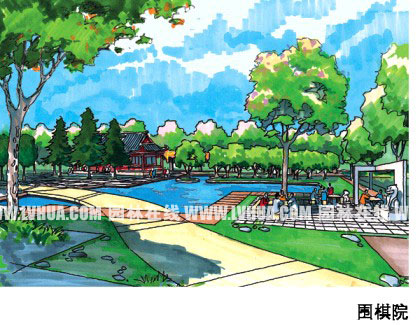 中心區設計為圍棋院廣場,由一個矩形樹陣圍合而成,包含了舊址圍棋院部分景觀.增加了兩條特色景觀路。 (四)兩條路 蓬萊公園的游園道路改造概念化為“兩條路”。一條是彎延流暢自然景觀路總長達1,000米,便于游人林蔭漫步,平面路形設計有無始終,用以強化自然生態的景觀效果。另一條路是人文景觀路,取自九曲橋,由東至西曲折穿過多個新增加的人文景觀節點,將公園文化活動有機地聯系到一起。