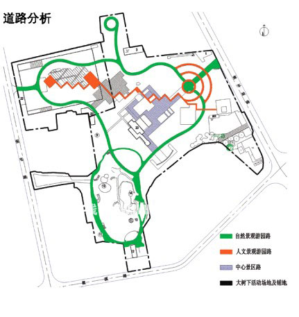 (二)公園定位為新型開放型城市公園,目的是更好地為城市居民服務.因此便捷的交通組織路線顯得尤其重要,游人的參與性可以得到大大地提高.使公園成為城市公共空間自然的一部分。