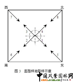 1.1.2 樣地的布設與調查 樣地選擇和設置的方法很多,而近景和遠景樣地的選擇不同,樣地規模也有所不同。評價照片一般要能全面代表調查地的景觀類型,數量取決于樣區景觀的多樣性程度及評價的方法。 鑒于天相時令、地形地貌、動物、建筑和文化景觀各自的特點,不專門用某種方法對它們進行取樣,而是結合在水平方向上最重要的道路、植物和水體3大構成要素綜合考慮[U1] 。 若調查對象面積很大,為保證調查結果的科學性和可靠性,應采取客觀取樣法,即概率取樣中的分層取樣法進行隨機取樣,照片數量取決于具體情況;若面積不是很大,則可采取全面調查法,主要分為以下2類: 1)線性樣地。 道路景觀可看作線性樣地,一旦樣點確定下來,可沿著一側選擇視點和方向拍攝采樣。視點既可等距,也可依路側樣地位置而定,拍攝角度與景色位置有關[8],如圖2所示。 ![]() 水體景觀可看作線性和面型相結合的樣地,但考慮到大多數情況下是在濱水區取樣,因此可參考線性樣地中道路景觀的做法,離開水岸線相同的距離,順時針繞水體行走選擇樣點,其余與道路景觀的采樣方法一致。 因此,線性樣地的每個樣點共得8張照片,其中景色較為封閉的確定為近景類型,沿著透景線方向的可視為遠景類型。 2)面型樣地。 植物景觀可看作面型樣地。在遠景中,常沿視軸或透景線方向采樣,也可根據景色質量的好壞和引人注目的程度來采樣;在近景中,有不同的取樣方法。此次研究在地形圖上分網格作為區劃單位,若遇到重點景觀或節點,則適當調整樣點的位置、樣地的大小和形狀,以網格中心為樣點進行取樣,向4個角各拍l張,然后再從4個角向中心各拍攝l張(圖3)。 ![]() 因此,面型樣地的每個樣方共得8張照片,其中景色較為封閉的確定為近景類型,沿著透景線方向的可視為遠景類型。 除此之外,還需對其他一些細節作出限定[9]:1)選擇同樣的天象拍攝。2)采用同樣的照相機鏡頭和彩色膠卷,且不使用閃光燈。3)拍照點的準確位置作永久標記。4)在相同的技術規程規定下完成。5)若遇到過分遮擋,可在左右1.5m之內移動,若還不能避開則回到原點拍攝。6)盡可能避免將非景觀因子拍攝在內。 1.1.3 評價照片的選取 照片數量主要取決于樣區景觀的多樣性程度,對于較單一的景觀可能僅用1張就夠了,類型多樣的則根據具體情況而定[10]。此次研究中,同一個樣地的一個景觀類型近景和遠景分別選取1張照片。 1.1.4 評價者的選擇 幾乎所有的研究都表明,不同群體的評判者在審美態度上具有明顯的一致性,且專家和專業學生的辨別能力和內部一致性最好,因此可根據方便來選擇評判者[11]。 鑒于評判的目的并不是為了弄清楚城市自然遺留地中某一景觀的得分值,而是為了掌握不同景觀在人們眼中的質量差異,因此可選擇大學生作為評判者。考慮到加權及概率分布規律,人數通常取20—50人為宜。