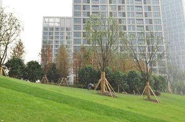 圖4 生態(tài)綠坡 水池、草地、巖石、砂礫等都以一種人工的形式表示出來,種植也都是整齊劃一的。樹木大多按網(wǎng)格種植。灌木修剪成幾何綠籬,花卉追求整體的色彩和質(zhì)地效果,成為嚴(yán)謹(jǐn)?shù)膸缀螛?gòu)圖中的一部分。 D片區(qū)對(duì)坡地的處理模擬山林景觀的效果突出“林”的效果,在坡底部分有較高覆土可能的區(qū)域種植高大喬木以達(dá)到綠色屏障的作用,在覆土較淺的區(qū)域以色葉小喬木為主突出季相景觀,技術(shù)上處理好覆土固定,防止水土流失的問題。 屋頂花園種植選用一些景觀效果較好的孤植樹木來增強(qiáng)景觀效果,主要以小喬木和灌木的方式處理花園以減少屋面覆土,在滿足建筑消防要求的前提下,利用圓形的設(shè)計(jì)元素將規(guī)劃道路弱化。充分結(jié)合景觀小品或植物的布置,打破規(guī)劃消防道路及登高場(chǎng)地對(duì)景觀帶來的影響。通過合理的高差設(shè)計(jì)以灌木綠化隔離作為圍墻在滿足景觀綠色屏障的效果下也方便了后期酒店的安全管理。 多元化感官景觀交融 世博村的居住型景觀B地塊緊緊抓住項(xiàng)目任務(wù)中要求的“國際多元文化”的需求,將規(guī)劃結(jié)構(gòu)中的四個(gè)組團(tuán)做了風(fēng)格的定位,以“東方”、“西方”、“工業(yè)”、“現(xiàn)代”為主題進(jìn)行景觀演繹,景觀強(qiáng)調(diào)對(duì)植物、水體、小品、鋪裝設(shè)計(jì)用也按照四個(gè)組團(tuán)來體現(xiàn)不同的個(gè)性,特別是植物的選擇強(qiáng)調(diào)組團(tuán)所要營造的都市氛圍不同的植物將配合不同的主題。強(qiáng)調(diào):“東方”的含蓄、婉約,在“東方”組團(tuán)中植物選擇有竹、梅、蓮等具有較強(qiáng)中式代表的搭配,氛圍塑造突出東方文化的安靜、平和;“西方”的序列、一律,選用一些修剪整齊的植物,強(qiáng)調(diào)對(duì)稱感、序列感;“工業(yè)”的寧重、滄桑,選用本地色葉樹種,以落葉樹種為主,強(qiáng)調(diào)季相景觀如梧桐、銀杏突出歷史的厚重與滄桑,在材料設(shè)計(jì)中結(jié)合現(xiàn)狀的改造建筑,將一些工業(yè)廢材二次轉(zhuǎn)換使用。“現(xiàn)代”的靚麗、摩登,除了簡(jiǎn)約的圖案和幾何構(gòu)圖外,在燈光聲效上相對(duì)突出,使用色彩較為鮮亮、明快,采用一些創(chuàng)性的手法的表達(dá)一些前沿文化。。