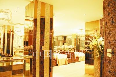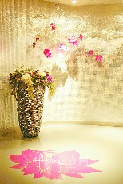 圖1:入口處的弧形墻設計。地面上烤漆的玫瑰花與墻面上的蝴蝶蘭相呼應,時尚雅致。