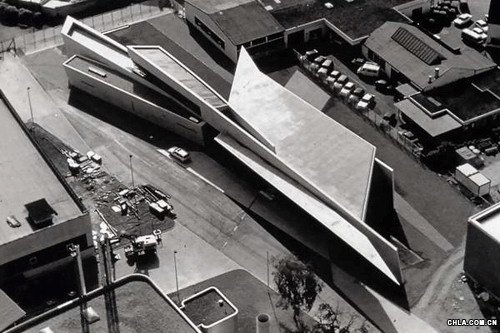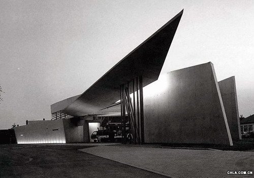 扎哈的作品在具有非凡的創造力和力度之外,也極具女性的想象力?吹皆脑O計圖,大多數人都會認為那是一種繪畫,那像爆炸一樣抽象的畫面只是畫而已,要實施簡直是天方夜談。(圖9)而在1993年,扎哈有機會完成了她的建筑處女作——德國巴伊爾。阿姆。萊茵的世界家具商維特拉公司的“消防站”的設計。這件很小的作品立刻轟動建筑界,成為當代建筑的經典作。(圖10、11、12)