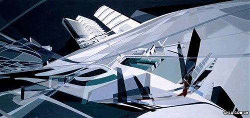 除了很少的幾個實施方案之外,她更多的是末付諸實現的紙上建筑,在那些更為抽象、也更為自由的空間里,她的奇思怪想發揮得更為淋漓盡致。(圖13、14)我曾經看過她的一張設計圖,以黑色為重色的圖中,門和窗似乎都獨立出來了,平面和線條仿佛都在空中飛行。有人這么評價她:“這個黑頭發的伊拉克女人似乎根本不是為地球上的建筑而設計,她的設計思想和建筑精神都沖破了地心吸力而進入了第三維空間”。這和她自己的說法恰巧吻合。她說:過去我認定有無重力的物體存在,而現在我已經可以確信建筑就是無重力的,是可以飄浮的。