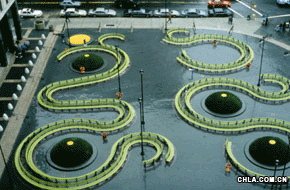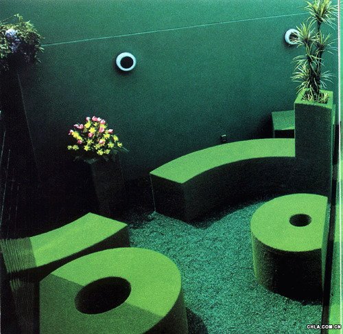 做為一個游離在現代藝術和景觀建筑邊緣的設計師,舒爾茲的設計幾乎每次出臺都引起業界的喧鬧,這一點和扎哈在建筑界的影響有點象。她們一向是那么囂張。她的作品,常常引入陶罐,彩色砂礫,人造皮。塑料植物,輪胎甚至面包圈和糖果等大眾的,世俗的,唾手可得而又轉瞬即逝的材料。表現出對傳統庭園形式與材料的調戲,同時她的園林又是美麗感性的,充滿了眩目艷麗的色彩和幾何圖案,充滿想象力和幽默感,完全體現了女性對生活的熱愛。(圖20)