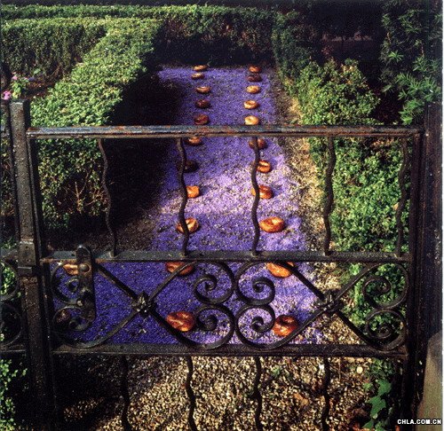 在表達思想和對現實的關注的同時,她的設計也是感性可愛的,流露出對生活的熱情。比如她曾經為慶祝她的丈夫出差一周返回而布置了一個面包圈花園。在黃楊籬方塊之間,舒爾茲布置了一條紫色的卵石帶,上面網格狀的放了72個經過防腐處理的面包圈。用明媚的色彩和生活化的材料創造了洋逸著小女人情懷的庭園。雖然這個有趣的設計并沒有維持幾天,不久就被貓破壞了,但是它卻成為了舒爾茲的代表作之一。(圖23)