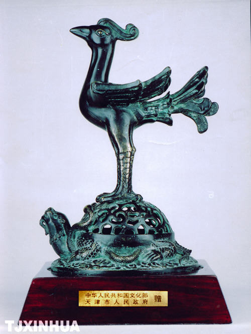 由天津高級美術師趙宗繼設計并監制的青銅雕塑"朱雀",于近日在蘇州結束的中國國際發明展覽會上獲得"銅獎"。據了解,這是此次展會上天津惟一獲獎的青銅藝術品。 此件青銅雕塑高32厘米,上為"朱雀",下為"玄武",整件作品形象設計栩栩如生。朱雀昂首挺胸,振翅欲飛,碩壯的雙腿屹立在玄武背上。作品參照了天津市薊縣東大井漢墓出土的鎏金青銅熏爐的一些藝術元素設計而成。 朱雀和玄武是我國古代道教所奉方位神,有驅災避邪的功能并象征吉祥、和美。"朱雀"青銅藝術雕塑脫胎于古代的熏爐文物,但新舊兩件作品的形象處理和內涵卻大相徑庭。設計者認真研究分析了熏爐的工藝形象,取其精華,保留了朱雀L型的身姿和雙腿的結構處理手法。同時借鑒了其他古文物的造型和裝飾。 作品下半部分"玄武"的造型設計,除保留熏爐原型的特點外,為增強厚重感,對"玄武"整體進行加厚處理。為了突出作品的中國傳統文化特色,趙宗繼翻閱了大量資料。最終確定的形象生動并富于變化。在"朱雀"青銅藝術雕塑表面效果的藝術處理上,作者也頗費了一番心思,在進行化學反應時,有意讓鳥的身軀漏出一些黃銅色,并于"玄武"的鏤空部分顯示出青銅的質感美。 該件作品曾在意大利"中國天津周"中,作為文化部和天津市的禮品贈送給羅馬市長等意大利政要。