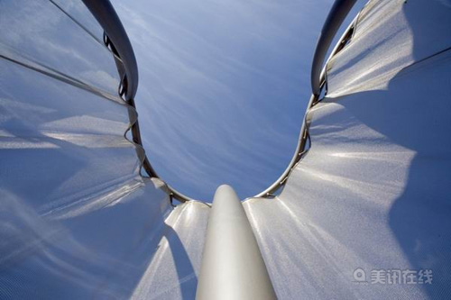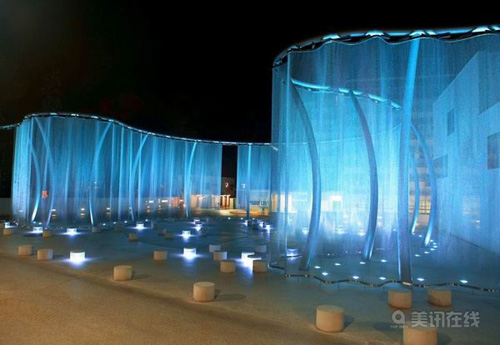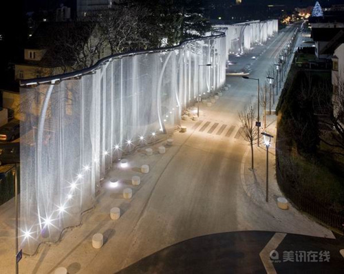 如神秘面紗一般的藝術外墻將整個博物館包圍起來,形成一種別樣的景觀,一種藝術的綜合體。它不僅僅只起外墻的作用,同時還是大門。這種半透明的材料沒有將施華洛世奇水晶世界完全隔離開來,而是讓路過的行人可以欣賞到一部分,從而引起無限的遐思。 即使是在大街的對面,也設置了這種銀色的外墻,與施華洛世奇水晶世界連為一體,營造出公共空間的流動過度性。“面紗”、景觀、照明和空間設計集合在一起,形成一種令人窒息的美妙風景。該外墻選用抗腐蝕、抗風化的網孔不銹鋼這一新型材料,用10米高的鋼柱支撐而構成,光照在上面形成有多種不同的反射效果。一組霓虹燈照亮了旁邊的石凳,形成第二道分界線。白天,太陽光線投過天空厚厚的云層照射在這個“面紗”上,會引起其不斷變化顏色;當夜幕降臨的時候,它可謂一片奇觀與夜色融為一體,顯得非常和諧。這座藝術外墻的建立為施華洛世奇水晶世界帶來永久、迷人的轉變。
