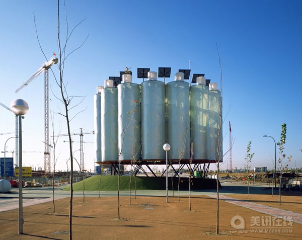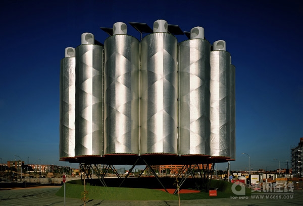 建筑師:Ecosistema Urbano建筑事務所 地點:西班牙馬德里,Vallecas地區 修建時間:第一階段為2004-2005年,第二階段為2006-2007年 結構設計:Tectum Ingeniería, S.L. 物業:IP Ingeniería 植物栽種:Ignacio López 工程監理師:Belinda Tato,Jose Luiz Vallejo,Diego García-Setién 圖片來源:Emilio P. Doiztua y Roland Halbe 這是位于西班牙首都馬德里附近,Vallecas小鎮上的生態大道( Eco Boulevard),由ECOSISTEMA URBANO建筑師事務所設計,此案為2007年AR新銳建筑獎(Architectural Review Awards for Emerging Architecture)最大獎「主獲獎者(WINNERS)」三件設計案之一。 Vallecas小鎮位于馬德里近郊。近年來小鎮的環境遭到了一些破壞,因此而動工的生態林蔭道工程便具有更重要的意義。建造之初的設計競賽就是為了選出更適合本地發展的設計方案,既要滿足社會功能,提供公眾活動的空間,又不破壞生態環境,改善自然條件。 這次比賽的獲勝者是一個年輕的設計公司Ecosistema Urbano。公共環境是屬于公眾的,必須要能滿足一些常規活動和特殊事件的需要,甚至在一些不能預知的突發事件時也要能保證市民的活動自由和方便。Ecosistema Urbano努力避免那些不負責任,毫無計劃性的設計,在設計最開始就預想到各種問題的解決方案。如今公司已經完成了多個這樣的建筑,他們稱它為“prostheses”,意為“彌補”。因為這些建筑都是臨時性的,其目的是為了彌補某些功能性的設計暫時沒有到位的缺陷。 整個生態林蔭道的重點是三棵空氣凈化樹。每一棵直徑有20米,易于安裝和遷移,且因為采用了光電技術,這些過程需要的能量都可以由它自給自足,蒸發和冷凝系統具有空調的作用,確保了在西班牙炎熱的夏日其內部溫度比外面低8到10度。第一棵空氣樹用來凈化空氣,其內部覆蓋有一層植被。第二棵里里外外都將種上植物。最后一棵也將披蓋一件類似的綠色外衣,但是它的內部卻是一個巨型螢幕,用來放映影片,還會有為觀眾準備的座位和遮擋風吹日曬的大遮蓬。
