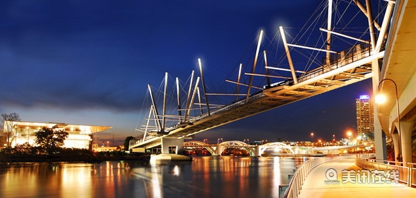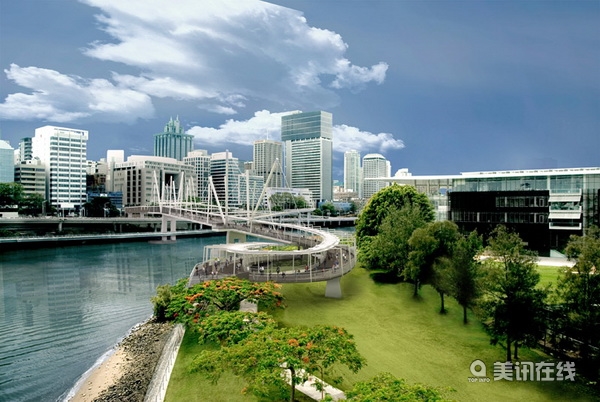 這項預算達6,330萬美元的Tank Street天橋工程,將為布里斯班市中心提供一個新的自行車及人行天橋通路,使得市中心區與南布里斯班彼此聯系起來,并通過另外一條行人與自行車橋——友好大橋將市中心與南岸公園連接了起來。 Tank Street天橋屬于由布里斯班市議會于2006年提出的之中心總體規劃與昆士蘭政府的2008-2006年昆士蘭東南地區技術設施規劃中的一部分。其設計與修建始于2007年10月1日,預計將于2009年9月完工,屆時正好趕上昆士蘭州150年紀念慶典。該天橋從Tank Street的北碼頭一端一直綿延到南布里斯班的Kurilpa Point,靠近新的昆士蘭現代美術館大樓。 Tank Street通過不銹鋼欄桿的裝飾,就像是用緊繃的鋼絲支撐而懸浮在空中的精美雕塑品,同時剛好處于南岸文化區與商業中心區法院的樞紐點上。 該天橋是一個多欄桿的纜橋結構,是按照非固定尺寸的原則而設計的整體結構,其建筑與工程機制在穩定張力與承壓構件之間達成了一種協同作用。