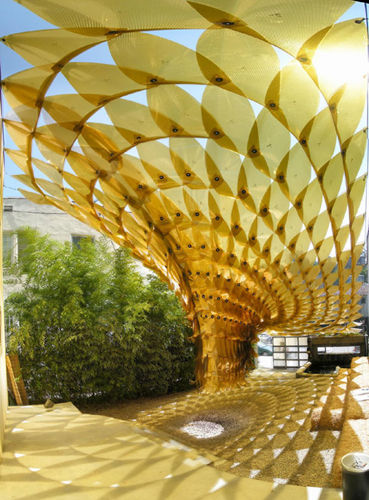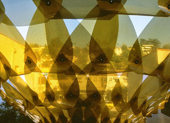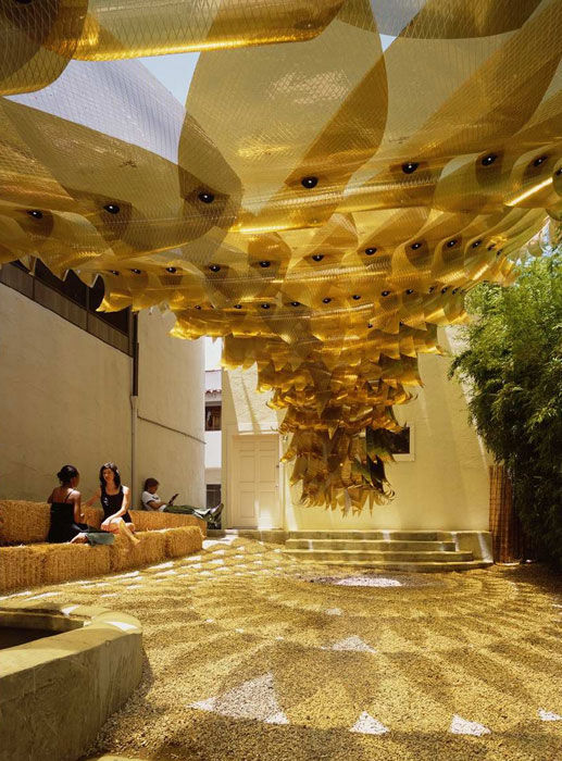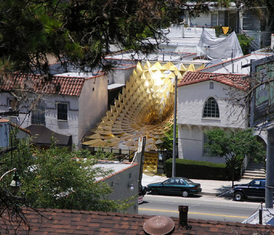像孔雀開屏一樣,羽狀屋頂是由一片片輕如羽毛的薄片連接而成,效果很神奇,很好地利用了兩個房子之間的空間,Ball Nogues 建筑事務所很善于設計各類不同凡響的屋頂: