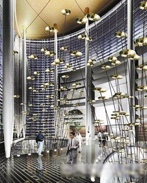 迪拜塔上的裝置藝術(shù) 西班牙雕塑家Jaume Plensa將成為第一位在世界最高的建筑上做公共裝置作品的藝術(shù)家,這件名為“世界之聲”的作品定于今年的12月份揭幕,并將安置在世界最高的建筑——高達(dá)800米的迪拜塔高樓上。 這件作品將包括196個(gè)青銅、黃銅,及鍍金材質(zhì)的打擊樂器鈸,每一個(gè)鈸的材料都來自不同的國家,它們合在一起會(huì)發(fā)出令人驚訝的柔和水聲,那聲音像是從天花板上滴下來的水滴的聲音。