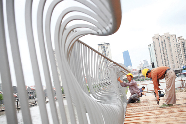 位于長(zhǎng)寧路一段蘇州河岸堤上,長(zhǎng)達(dá)600余米的觀景平臺(tái)以新穎的造型顯露在市民眼前。此段觀景平臺(tái)取代了以前光禿禿的防波堤,采用了波浪造型的鋼制欄桿并輔以原木質(zhì)地的平臺(tái)路面,給人耳目一新的感覺。據(jù)悉,整個(gè)觀景平臺(tái)的施工工程將在9月下旬基本完成,并將展開整體綠化等后續(xù)工程。
