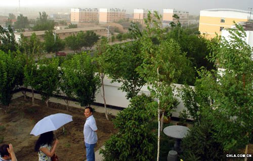 據克拉瑪依區環保局那仁副局長給我們介紹,這個美麗的空中花園是在2005年建起來的,由于他們的局長王長嶺酷愛綠化,在建大樓時已經設計了樓上建立花園的最初方案,對樓上花園綠化管線的分布以及樓地基設計都進行了很好的安排,泥土層、沙石層及防滲處理都安排得當。我們看到大約300平米的樓頂綠化地,布置的很合理,有蔬菜,花卉,蘋果樹,櫻桃樹等7種樹木,長勢特別茂盛。那仁介紹“屋頂花園”經過專家論證非常適合克拉瑪依這樣干旱、高溫的城市發展,對樓房建筑不產生負面影響,并且能明顯的改善生態。
