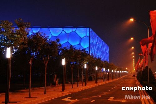 5月25日晚,國家游泳中心“水立方”,外景燈在進行調試。 中新社發 馮軍(北京) 攝