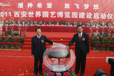 11月10日上午,2011西安世界園藝博覽園建設啟動儀式在西安浐灞生態區廣運潭景區隆重舉行,國家林業局局長賈治邦,省委書記、省人大常委會主任趙樂際共同觸摸了象征啟動“2011西安世界園藝博覽園建設”的水晶球,并開通了“網上世園會”。參加儀式的領導給孩子們分發“播種希望”的種子,共植“西安世界園藝博覽園建設啟動紀念樹”。全國政協人口資源環境委員會副主任、中國花卉協會會長江澤慧,中國國際貿易促進委員會副會長王錦珍,省委常委、常務副省長趙正永在儀式上講話。市委常委、宣傳部長、浐灞生態區黨工委書記、西安世界園藝博覽會籌備委員會副主任王軍介紹西安世園會的籌備、建設情況。省委常委、市委書記孫清云主持儀式。