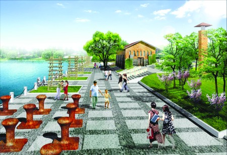 根據(jù)規(guī)劃,小清河北岸設計方案利用空間的劃分、雕塑的創(chuàng)意等園林手法,集中展現(xiàn)小清河深厚的文化底蘊。在景觀文化線中,設計了7處景點:作為城市空間出現(xiàn)的清河水韻和滄桑黃臺;展現(xiàn)地域文化的石磨余香、俚風傳揚、荷恬凝碧;“演進”和水岸鵲華兩處點景空間。