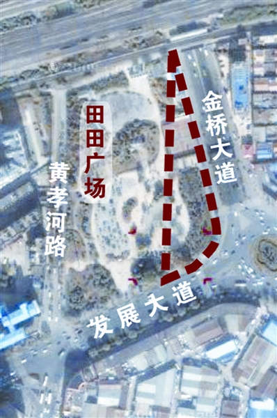 根據建設規劃,田田廣場東南側上方將建設竹葉山立交匝道,施工結束后再重新綠化。遷移范圍從北側鐵路開始,沿弧線走向發展大道,遷移面積約2000平米。遷移后,田田廣場將從目前的不規則四邊形變成一把“菜刀”(如圖)。施工方介紹,除綠化外,廣場內東南角的部分休閑場地也將被“切”掉,但面積僅數十平米。