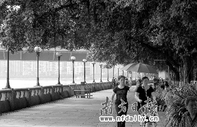 榕蔭下的濱江路人行道是市民晨練、休閑的首選地之一。