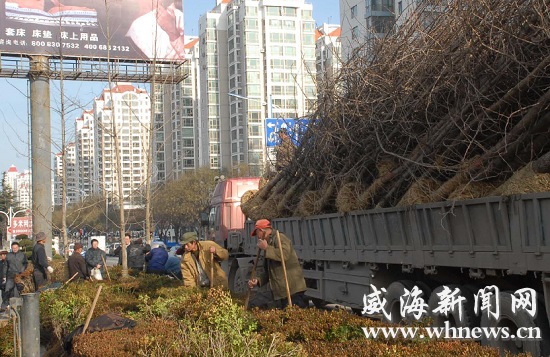 12月14日,市區海濱路、青島路、世昌大道、文化路今冬明春綠化工程啟動,這是當日上午,園林工人在青島路綠化帶內栽植景觀樹。