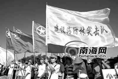 圖為兩年前由海口市數千名干部、群眾、武警和學生組成的植樹大軍在?跂|海岸宣誓營造海防林。 本報記者 王凱 攝