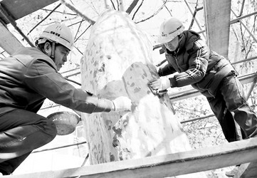 這是樹桿嗎?是樹桿為什么涂油漆?其實,這不是普通的樹桿,而是為百年古樹新研制的用作支撐的加強型樹脂軟膜樹桿;工人正在涂抹的也不是什么普通油漆,而是環(huán)保型涂料。這是上海為保護百年古樹首次使用的最新技術(shù)。針對靜安公園一株百年以上的古懸鈴出現(xiàn)主干樹體被蛀空且腐爛的現(xiàn)象,靜安區(qū)園林綠化部門對其實施復(fù)壯與樹體修復(fù)工程。記者日前見到,用加強性樹脂軟膜對原有的樹皮表面肌理進行翻膜制成的新樹桿,幾乎保持原樣、以假亂真。技術(shù)人員還對樹體內(nèi)部用木炭和植物傷口涂補劑、殺蟲殺菌劑進行填補。這些新技術(shù)將運用于上海上千棵百年古樹的保護工程。