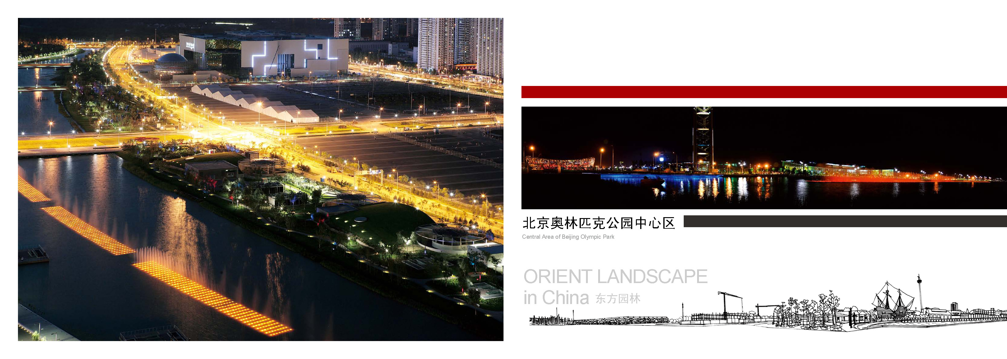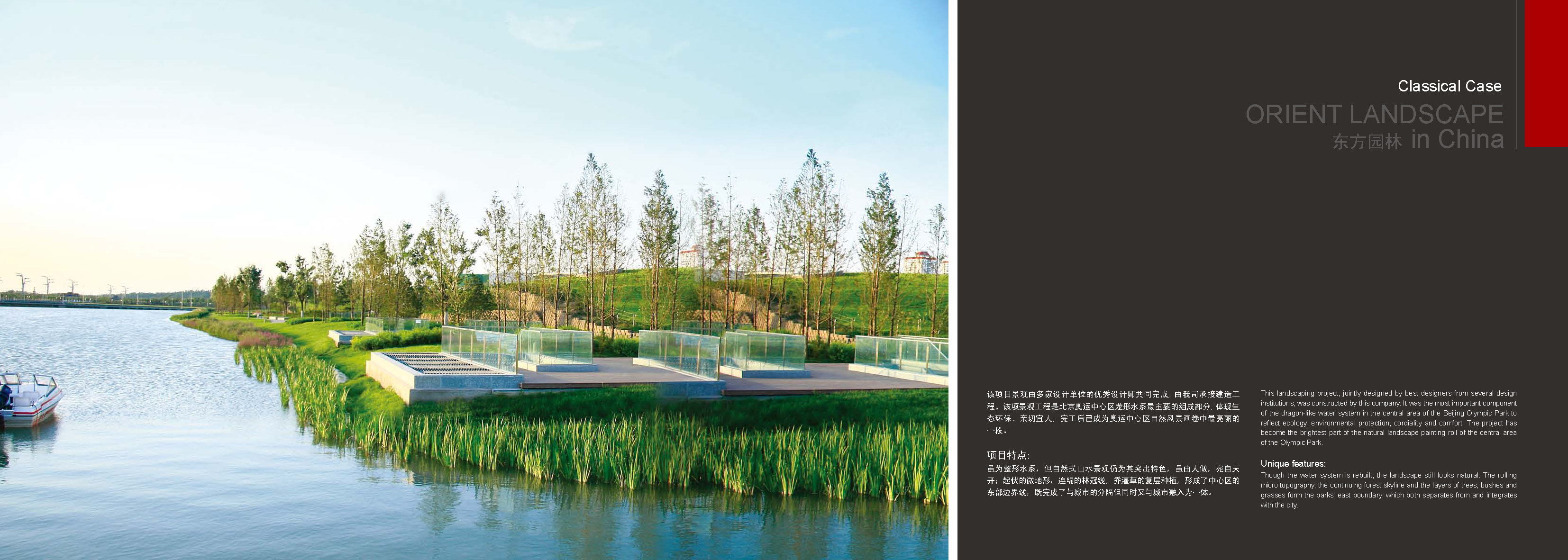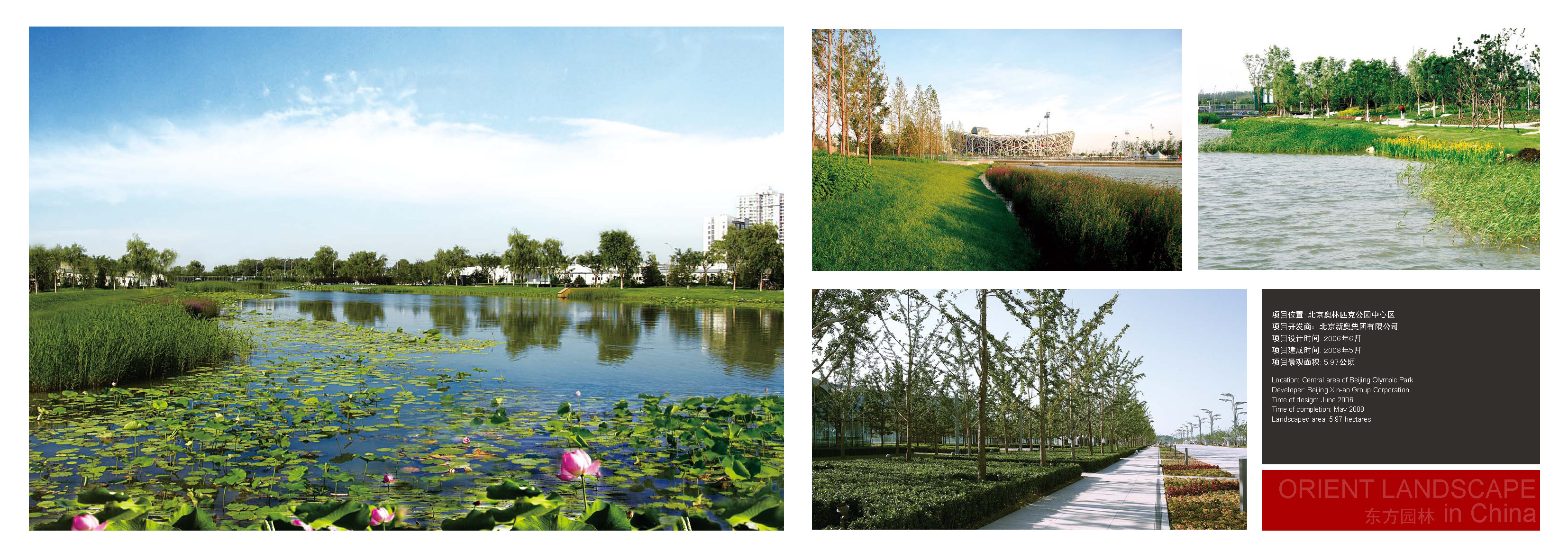 該項目景觀由多家設計單位的優秀設計師共同完成,由北京東方園林股份有限公司承接建造工程。該項景觀工程是北京奧運中心區龍形水系最主要的組成部分,體現生態環保、親切宜人,完工后已成為奧運中心區自然風景畫卷中最亮麗的一段。