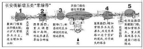在此次工程中,結合去年長安街道路拓寬拆遷騰退,在新昌胡同至石碑胡同即北京音樂廳前,以及察院胡同至教育西街,位于民族文化宮對面等地區,新增綠化面積超過2萬平方米,使得長安街南北“綠毯”首次貫通。