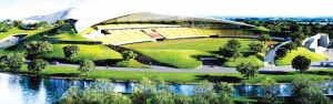 在現場,記者看到了體育公園體育場效果圖,體育場建筑造型宛如一塊紅邊綠色地毯裝點著西區。