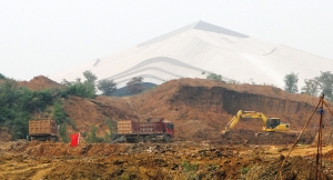 在現場記者看到,工地內機聲隆隆,車來人往。在靠近體育館的一側,幾臺挖掘機正伸展巨臂,奮力開挖,取走高山坡上的泥土;而在挖掘機旁,則是一長排等候運送泥土的車輛,浩浩蕩蕩。