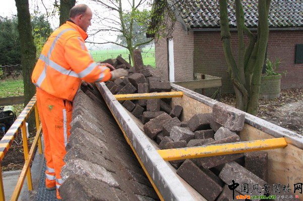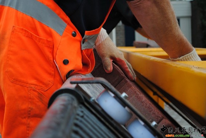 在一個(gè)傾斜的平面上,工人將用于鋪路的磚塊放進(jìn)去,通過(guò)電動(dòng)履帶的慢慢帶動(dòng),由于重力的影響另外一頭就能輸出排列整齊的磚塊道路,并且自動(dòng)鋪設(shè)到路面上,每天每輛Tiger-Stone可以鋪設(shè)近400米的道路,令人稱奇的是它還能夠調(diào)整6米之內(nèi)的輸出范圍。