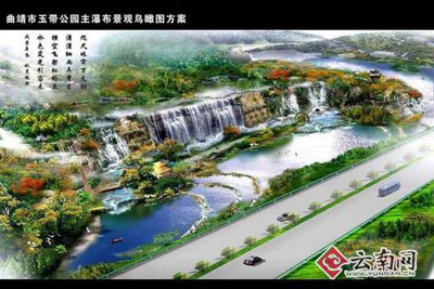 今后,從昆曲高速公路進入曲靖的各地游客,您見到的將不只是高速路上那枯燥的廣告牌和兩側相繼出現的交通標志牌,在距離曲靖收費站以西1.5公里處,全堰幅寬90米,最大跌落高度為23米的玉帶公園瀑布群將猶如一幅仙境美圖躍入您的眼簾。