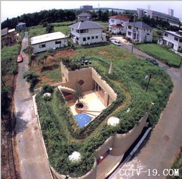 牛田·梵德雷聯合設計公司1994年為筑波的一對年輕夫婦設計了一座茅草屋。運用草皮作為屋頂的保溫隔熱材料的歷史已有好幾個世紀。在京都暖和的氣候條件下,“茅草屋”的草屋頂有了另外的功能,即用來隔絕夏天的熱氣,使室內保持舒適的溫度。這個面積很大而形態自由的屋頂花園上種滿了各種木本植物,許多花草都長過了外墻和內墻。除了保溫隔熱作用之外,這個屋頂還是個休閑娛樂的好去處,為這個擁擠的城市節約了寶貴的地面空間。