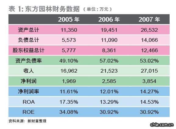 中國園林行業的龍頭公司正通過加強研發投入,并借助創新商業模式向產業價值鏈的上游發展,東方園林是其中一個范本。東方園林以設計拉動產業鏈,構建一體化園林服務商業模式,成為國內承接千萬元以上項目最多的園林公司。 但是,中國園林行業的發展,除了需要提高研發水平、創新商業模式,資本也將扮演更加重要的角色。資本不僅能為公司的內生成長提供支持,而且引導行業的并購整合,其中,綠大地已經在深交所中小板上市,并借助IPO募集資金向專業苗木供應商的方向發展。多達14000家、最大82家園林公司的跨省市收入僅占總收入17%的事實,暗示了中國園林市場的整合潛力巨大,也從側面展示資本在其中縱橫捭闔的空間。 東方園林2007年收入超過2.7億元,凈利潤接近4000萬元,最近3年的收入、凈利潤復合增長率分別達25%、40%(表1)。