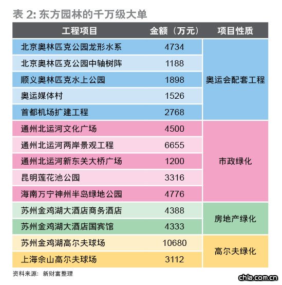 苗木基地,滿足大型項目多樣化苗木要求 轉型為一體化園林服務商后,東方園林的苗木培育從對外銷售為主轉變為內部使用為主,為中標的園林工程提供苗木支持,成為公司園林工程的一個環節。在對外銷售模式下,需要對同一品種進行規模化種植,從而降低培育成本;而在園林工程服務模式下,由于不同園林綠化工程項目的設計差異,不僅在數量規模上有一定要求,而且對苗木的多樣性也有更高要求,需要根據設計要求搭配不同種類的花卉苗木。因此,東方園林著力打造規模大、苗木資源豐富的大型綜合性苗圃,除浙江武義之外,在不同氣候帶、同時也是重點發展市場的北京增設兩個培育基地,其中武義苗木基地以華東地區常用大規格新優苗木為主,北京的北七家苗木基地、大東流苗木基地則分別以四級常綠苗木、大規格落葉喬木為主。同時,公司也增加品種的多樣性,武義基地僅茶花就50多個品種。 東方園林品種繁多的苗木培育基地,也是ESDA決定與之合作的重要因素。當時花卉苗木供應尚不充足,ESDA的設計需要多品種苗木才能達成預期效果。 工程施工,一體化服務提高盈利能力 東方園林具有城市園林綠化一級企業資質,根據《城市園林綠化企業資質標準》規定,只有一級企業資質企業可以不受限制承攬各類園林項目,而二級、三級企業分別只能承攬800萬元以下、300萬元以下的園林綠化項目。東方園林具有園林甲級工程設計資質的東方利禾和ESDA-ORIENT組合,使其能夠駕馭各種園林工程設計需求,苗木基地則可以支撐設計方案,最后通過施工順利實現項目利益的一體化收割。 東方園林的運作模式對行業內企業有一定借鑒意義。中國風景園林學會對82家規模以上園林公司調研作出的《中國城市園林綠化企業經營狀況調查報告(2006)》(以下簡稱《報告》)顯示,77%的公司總資產低于1億元,70%的公司營業收入低于1億元。其中,東方園林是7家同時具有城市園林綠化一級企業資質和甲級工程設計資質的企業之一,相當數量公司或者在設計能力、或者在施工能力存在短板,而其中任何一個短板,都讓它們失去承接大型項目的機會。 在行業內國內公司競爭力偏弱的情況下,東方園林等7家企業在承接千萬級大單的競爭上優勢明顯。中國風景園林學會的調查結果顯示,2006年共計67家企業完成了216個造價1000萬元以上的園林項目,大項目收入總和超過1億元的公司共四家,其中東方園林位列首位。相關資料顯示,東方園林在奧運配套工程、市政綠化、房地產綠化、高爾夫綠化等均承攬了千萬級大單,其中蘇州金雞湖高爾夫球場項目甚至超過1億元;此外,北京奧林匹克龍形水系、通州北運河項目、海南萬寧神州半島綠地公園、蘇州金雞湖酒店等項目均超過4000萬元(表2)。