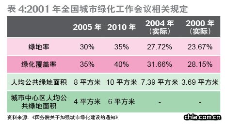 政府財政投入將達2200億元 由于園林綠化的公共設施性質,政府財政資金的投入規模對城市園林行業的發展具有決定性影響。隨著科學發展觀對環境保護要求的提高,政府在園林綠化方面的投入將顯著增加。具有標志意義的事件是,2001年初的全國城市綠化工作會議上,《國務院關于加強城市綠化建設的通知》對綠化作出詳細部署:一方面,加大政府財政對園林行業的支持,“城市綠化建設是城市公共財政支出的重要組成部分,要堅持以政府投入為主的方針”;另一方面,針對綠地率、綠化覆蓋率、人均公共綠地面積、城市中心區人均公共綠地面積等提出了量化目標,其中2010年的綠地率、綠化覆蓋率、人均公共綠地面積分別要求比2000年增加42%、47%、171%(表4)。