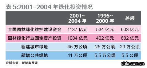 在政府的推動下,財政投入向綠化行業傾斜。2001-2004年的4年間,全國園林綠化維護建設基金、園林綠化行業固定資產投資分別高達1137億元、1084億元,分別比1996-2000年5年的總投入高出113%、170%。在財政投入支撐下,中國城市綠化程度有一定提高,其中2004年綠地率、綠化覆蓋率分別比2000年增加4個、3.5個百分點(表5)。