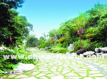 圖為青石板鋪設(shè)的園路,寬闊平坦。石板縫隙間青翠的小草讓“原始”韻味更加濃郁。