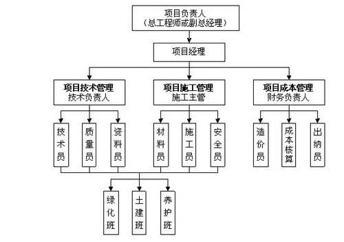 園林綠化工程與其他的工程建設一樣,質量是第一位的,每一個園林綠化施工都是一個藝術創造的過程,施工質量的好壞直接影響到園林綠化工程的品質。本文根據自己的實踐經驗,對園林綠化工程的施工質量管理談點粗淺體會,與同行一起探討。 1、現場質量管理策劃 質量管理是實現工程質量目標的保證,為此我們在工程項目確定后,項目部按照ISO9001質量管理體系標準,結合公司質量管理體系的框架,對現場質量管理進行策劃。 1.1確定工程質量目標 質量目標是合同的要求,也是我們施工單位滿足顧客要求的努力方向。一般我們的工程質量目標根據工程合同要求定為:一次性驗收合格率(如100%)、工程質量等級(合格或優良)、苗木成活率(如100%)等。 1.2組建現場組織機構 現場組織機構是工程項目建設的核心,一個精干、有效、科學管理的領導班子是工程項目質量的保證。 我們建立以公司派出的項目負責人為首組成的現場質量管理組織機構。為確保工程質量目標的完成,我們建立和健全各級崗位責任制,明確質量管理人員的工作職責和權限,使工程質量管理工作規范、有序的進行。 圖1 現場質量管理組織機構圖