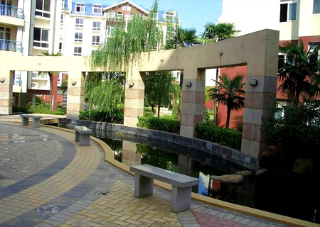 設計在景觀軸上主要以水體做媒介,利用水體形式轉換打破小區規劃相對平淡的狹長空間,利用復雜地形高差關系,營造東南亞特有景觀氣質。組團景觀在組團內單調線形空間中突破局限,從形式上與主軸相一致,在內容上尋求變化。空間上注重高差變化,使建筑、水景、人行與綠化之間和諧共存,形成觀景、休息、動態景觀和交通轉換有張有弛的多層次空間。
