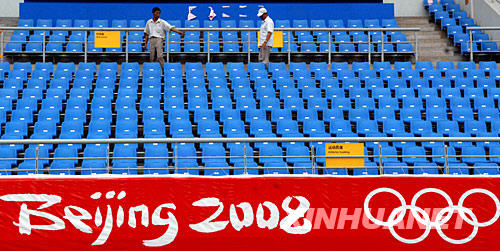 圖為兩位工作人員在沈陽(yáng)奧體中心五里河體育場(chǎng)內(nèi)檢查觀眾席的座位(攝于7月22日)。 新華社記者謝環(huán)馳攝