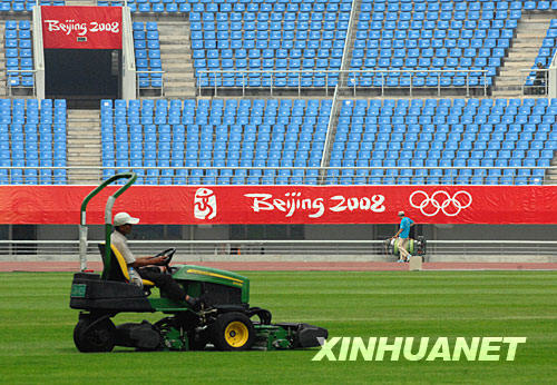 圖為一名工作人員駕駛綠化作業車在沈陽奧體中心五里河體育場內修整草坪(攝于7月22日)。 新華社記者謝環馳攝